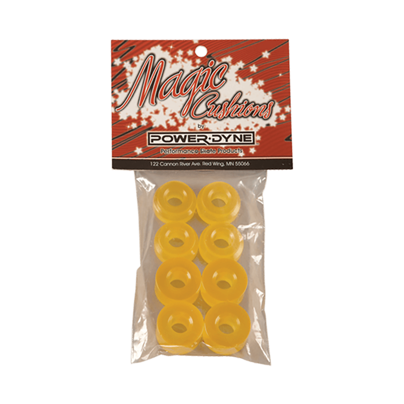 Unique to PowerDyne Magic Cushions is the Power Assist™ formula for total performance. Made from high-quality urethane, Magic Cushions (some people call them "bushings") retain energy and release it when you need it most. Just like shocks on a car, Magic Cushions soak up the imperfections of the surface, keep you connected to the road ahead through enhanced feedback, load up when pressed to the limit, and then release your stored power in a forceful yet predictable manner. Available in multiple colors/hardnesses, they are the most responsive cushions available for your skating skills.