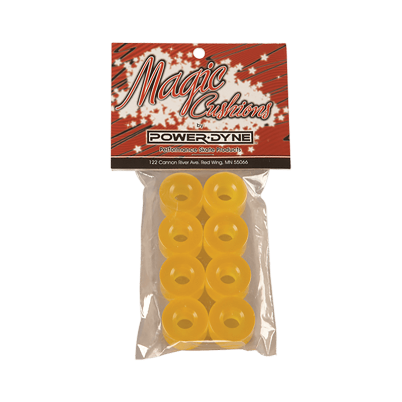 Unique to PowerDyne Magic Cushions is the Power Assist™ formula for total performance. Made from high-quality urethane, Magic Cushions (also referred to as "bushings") retain energy and release it when you need it most. Just like shocks on a car, Magic Cushions soak up the imperfections of the surface, keep you connected to the road ahead through enhanced feedback, load up when pressed to the limit, and then release your stored power in a forceful yet predictable manner. Available in four colors/hardnesses, they are the most responsive cushions available for your skating skills.